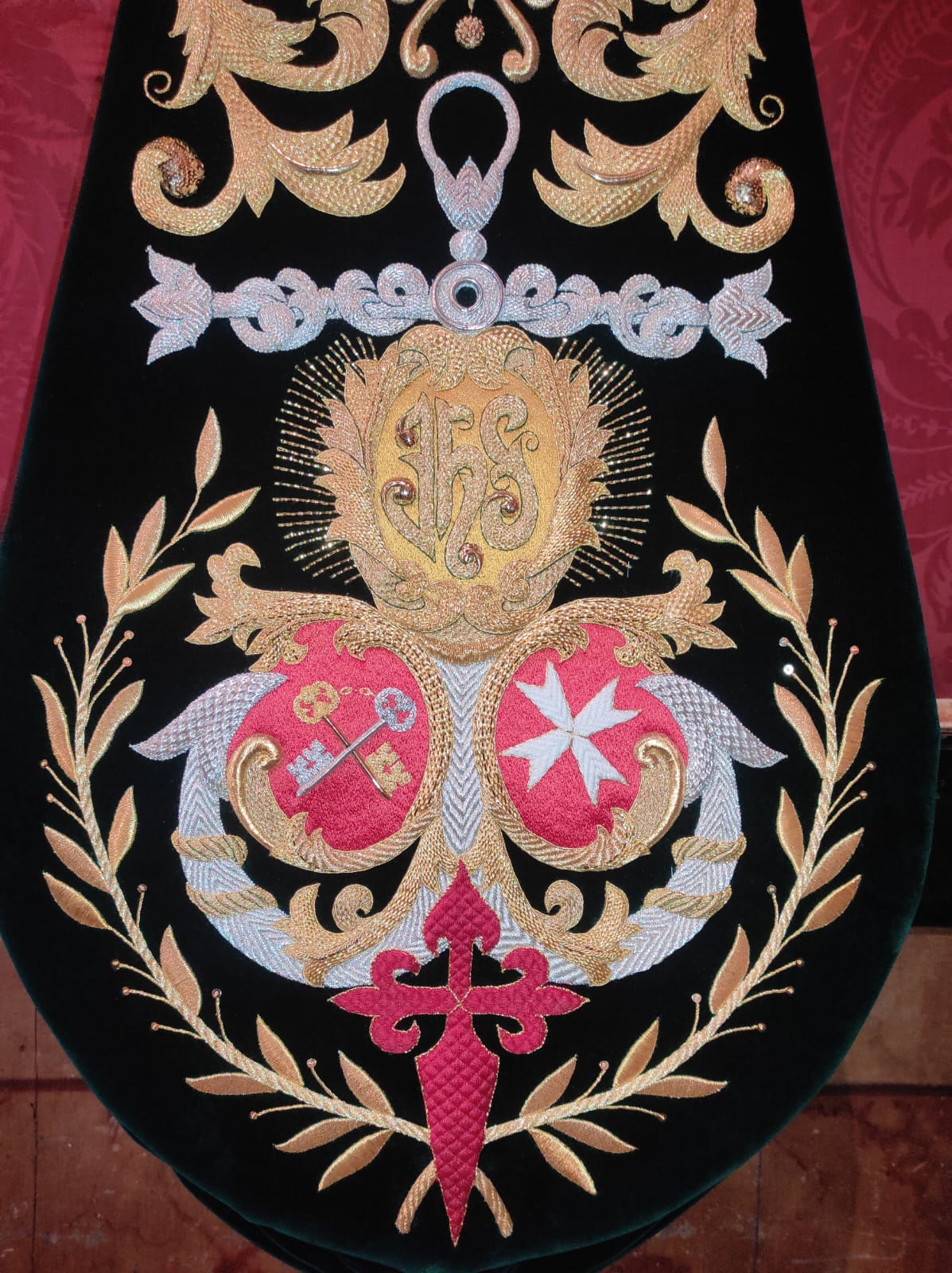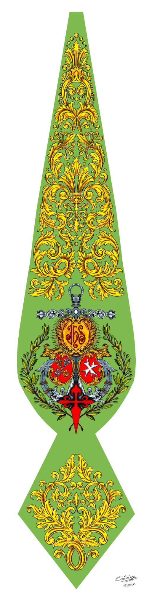 El guion lo han bordado miembros de la Agrupación dirigidos por el bordador Francisco Franco. El asta del mismo, en latón pulido y plateado, se ha compuesto en los talleres de orfebrería Bernet.
