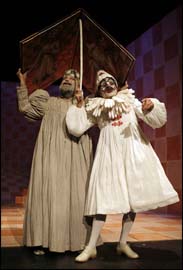 Dos máscaras –Quijote y Sancho- en el juego hábil de un misterio y oculto bululú. A veces no se puede decir quien es más sabio. Dos marionetas que improvisan un gracioso y estudiado contrapunto. En ocasiones se diría que hasta -¡Oh maravilla!- da la impresión de que intercambian los papeles. En tres palabras: ¡dos buenos cómicos!.