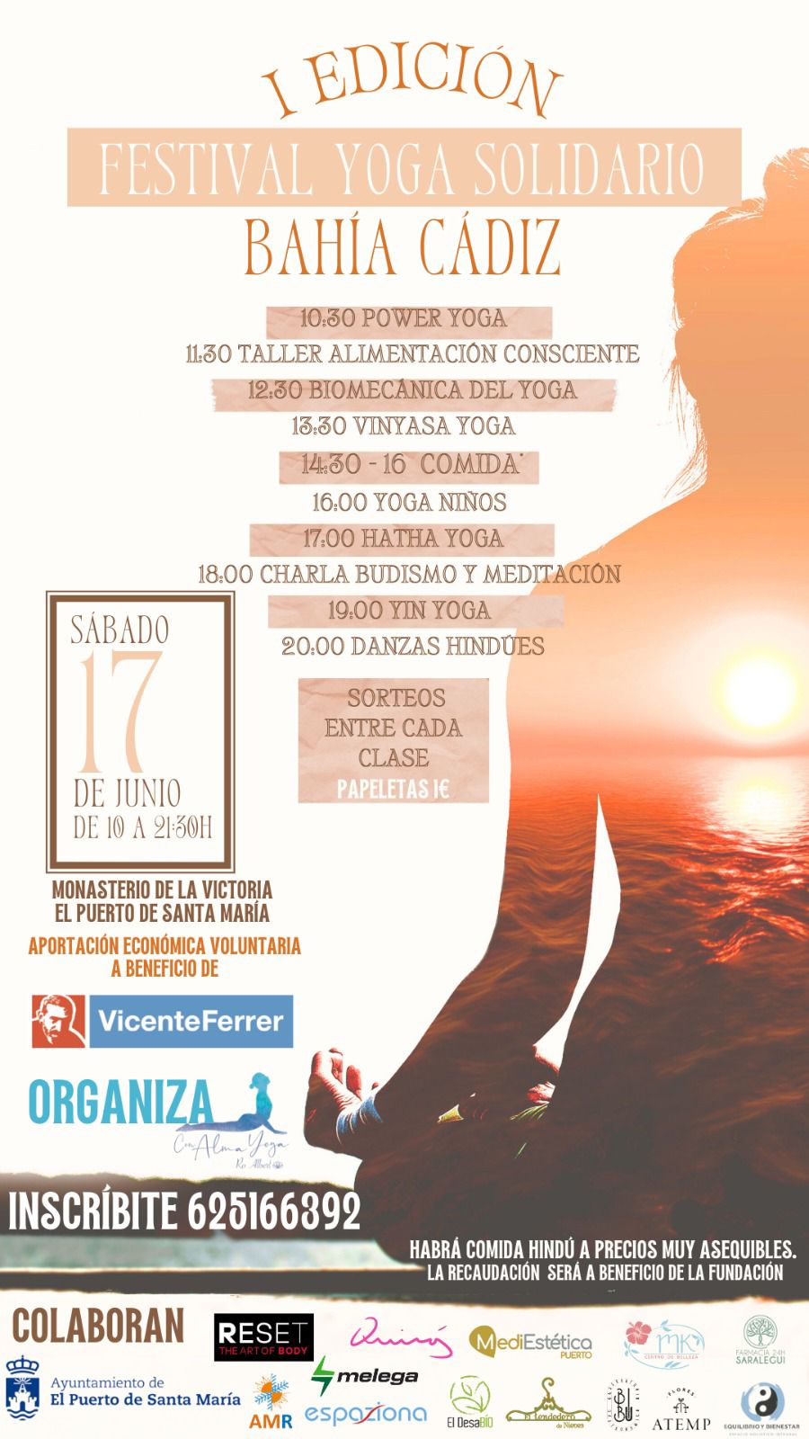 Rocío Albert señala que las personas interesadas en participar en el Festival, que se desarrollará entre las 10:00 y las 21:30 horas, han de inscribirse previamente a través del correo electrónico conalmayoga@gmail.com . La jornada, que se puede disfrutar con independencia del conocimiento de que se disponga sobre el mundo del yoga, comenzará a las 10:00 horas con la presentación de la misma a cargo de Rocío Albert y de Rafa Carmona, delegado de la Fundación Vicente Ferrer en Andalucía, Extremadura, Ceuta y Melilla. A las 10:30 horas tendrá lugar una sesión de Power Yoga para proseguir a las 11:30 con un taller de alimentación consciente. El programa contempla a las 12:30 una sesión de biomecánica del yoga, a las 13:30 horas Vinyasa yoga y, entre las 14:30 y las 16:00 horas, el almuerzo, para el que la Fundación ha contratado a unos cocineros que elaborarán comida hindú, destinándose la recaudación íntegramente a la entidad benéfica. A las 16:00 habrá yoga para niños, a las 17:00 hatha yoga, a las 18:00 una charla sobre budismo y meditación que impartirá la monja budista Guen Paglam y a las 19:00 yin yoga, para finalizar a las 20:00 horas con danzas hindúes.