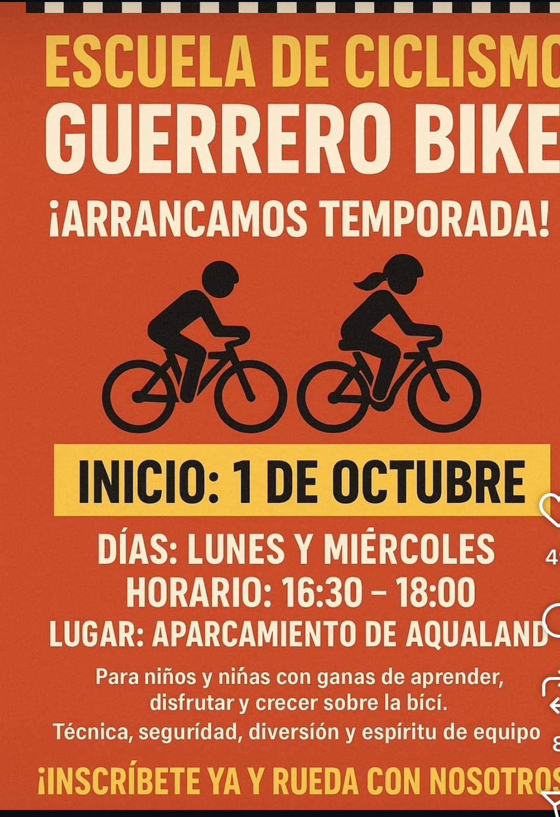 La Escuela, presidida por Guerrero, invita a niños y niñas a partir de los 4 años a participar en las concentraciones que se celebran los lunes y miércoles, de 16:30 a 18:00 horas, en el aparcamiento próximo a Aqualand. El campeón destaca que la actividad está enfocada a la "técnica, seguridad, diversión y espíritu de equipo", y pensada para que los pequeños "disfruten, aprendan y crezcan en el ciclismo".